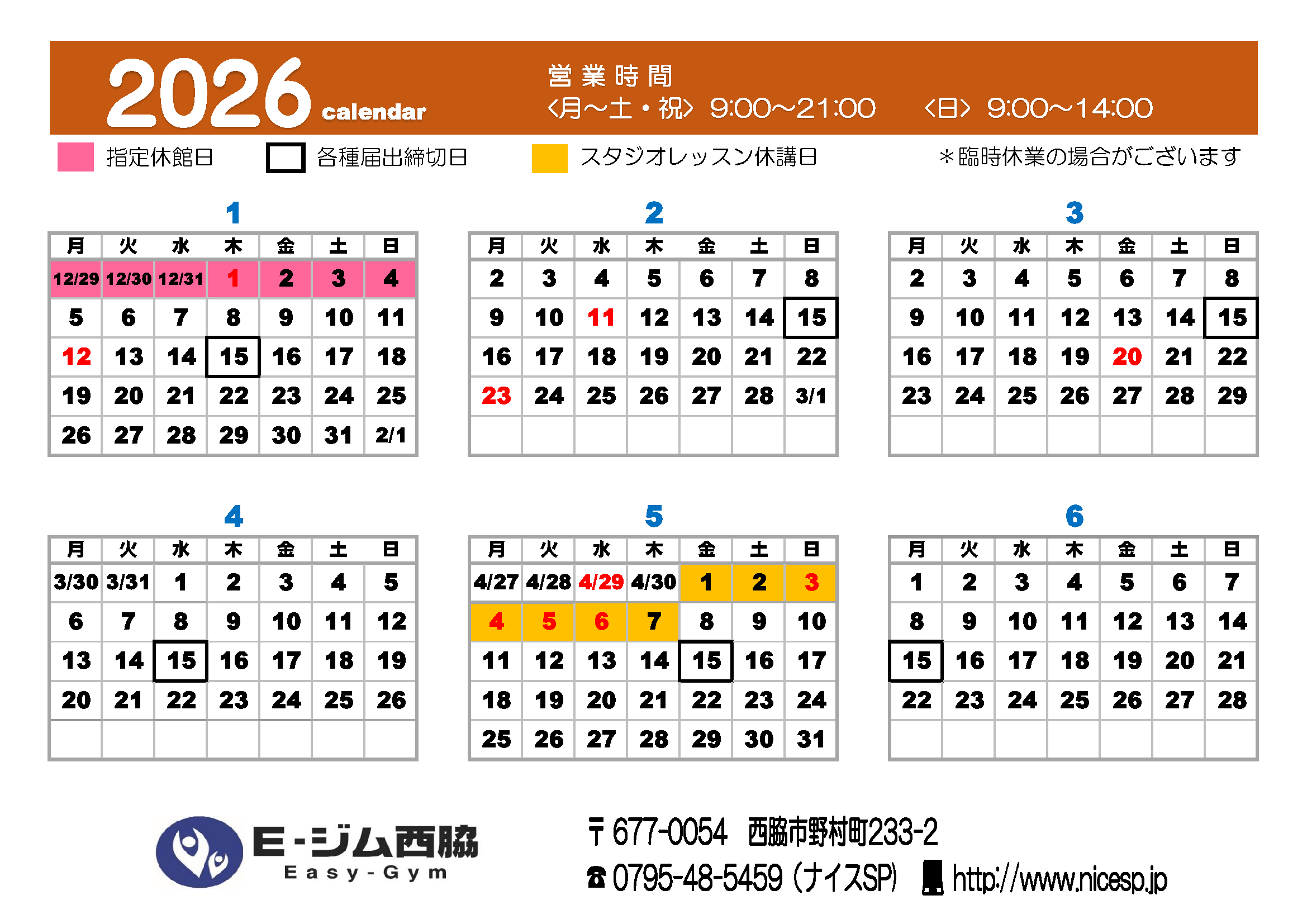 営業日カレンダー 投稿日2021年11月17日2025年12月22日投稿者nice_admin 【ナイススポーツプラザ】 ※当館指定の休館日がございます、ご確認ください。 2026年1月~6月 2026年7月~12月 画像クリックで拡大ページが表示されます。 2025年1月~6月 2025年7月~12月 画像クリックで拡大ページが表示されます。 【E-ジムカレンダー】 ※当館指定の休館日がございます、ご確認ください。 2026年1月~6月 画像クリックで拡大ページが表示されます。 2025年1月~6月 2025年7月~12月 画像クリックで拡大ページが表示されます。